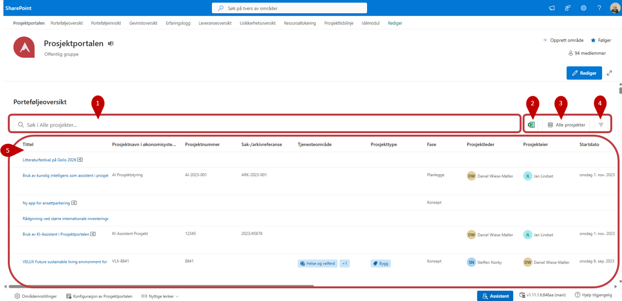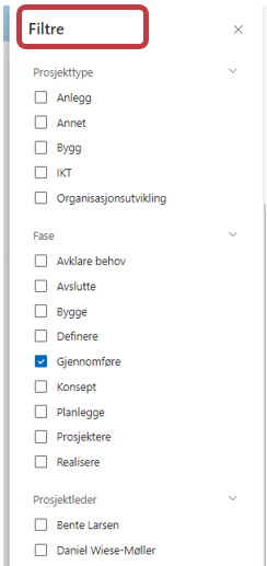 Porteføljeoversikten gir et øyeblikksbilde over alle prosjektene i porteføljen. Denne oversikten kan enkelt endres slik at du ser den informasjonen du trenger.