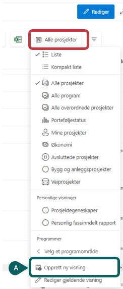 A) Trykk på “Opprett ny visning” for å opprette ny visning. Rettighet til å opprette nye visninger er styrt på listenivå. Listen er tilgjengelig gjennom konfigurasjons-siden for Prosjektportalen 365.