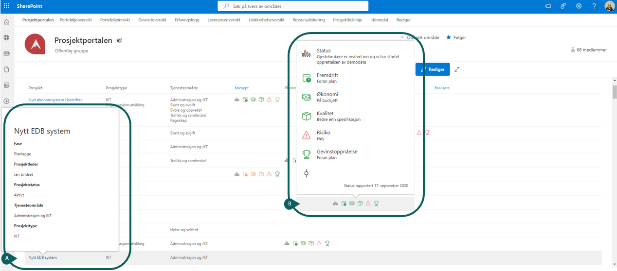 B) Hold muspekeren over Statusikonene for å få mer detaljert informasjon om ststus på prosjektet