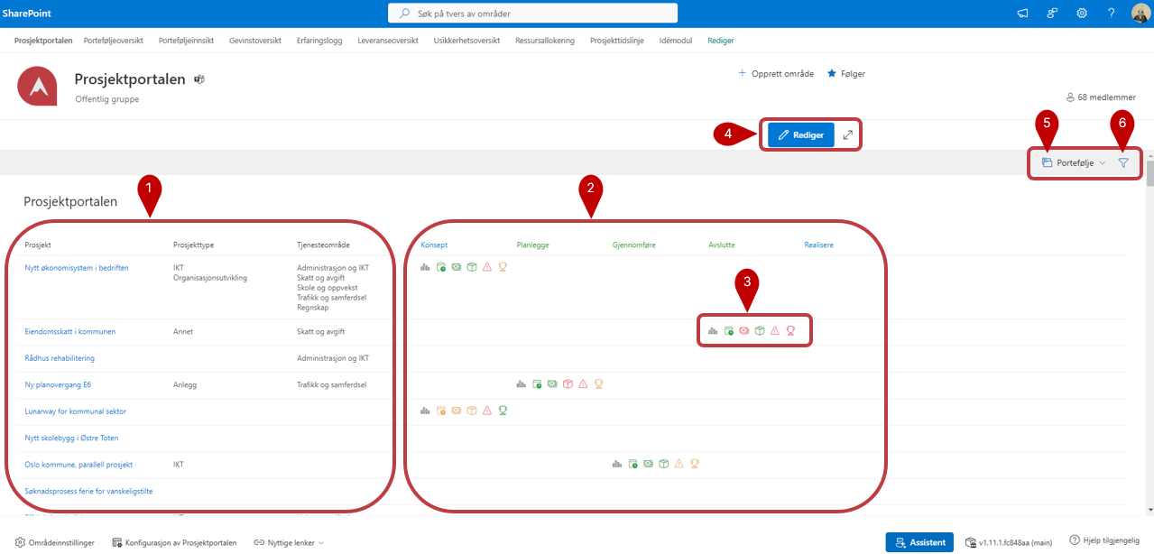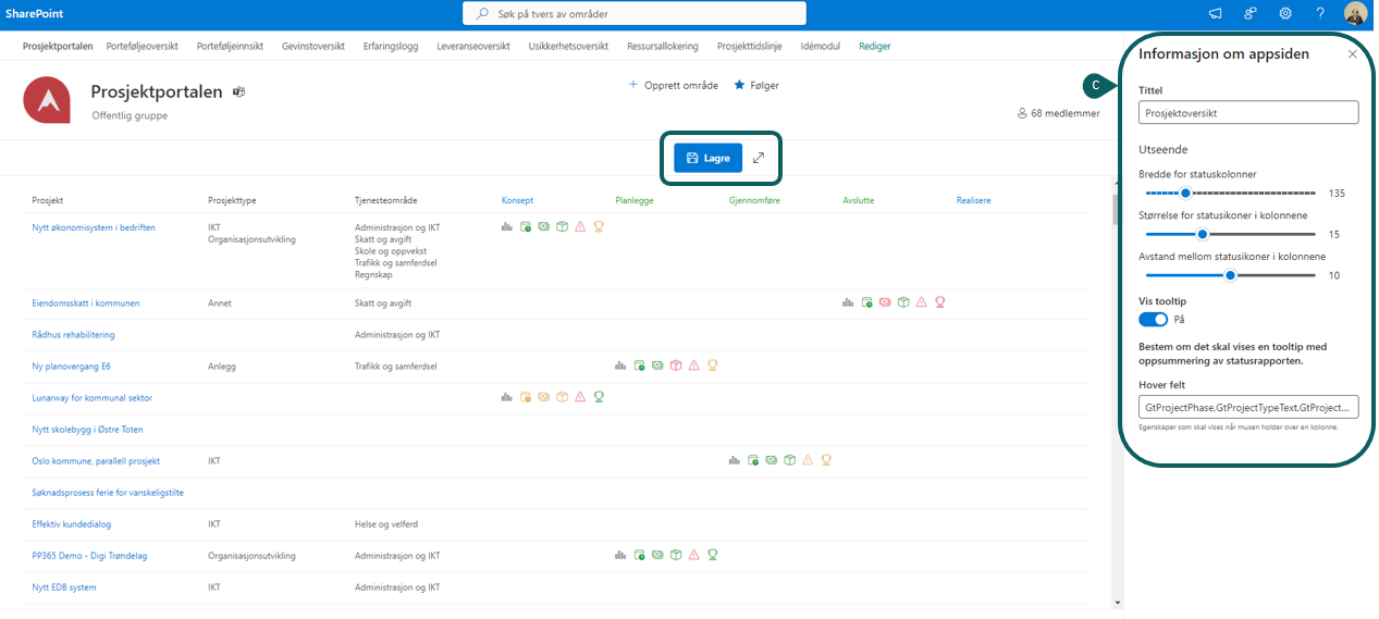 Status ikoner: Dessa ikoner gir en visuell og øyeblikkelig oversikt med status for prosjekter i pågående fase. Se bilde og mer info under (B).