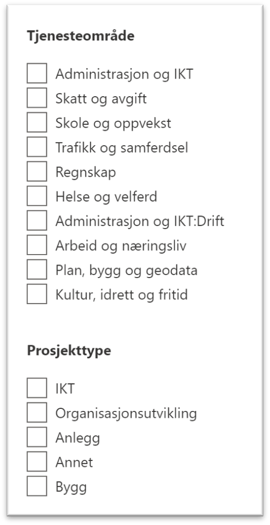 -knappen og du kan filtrere på Tjenesteområde eller Prosjekttype.