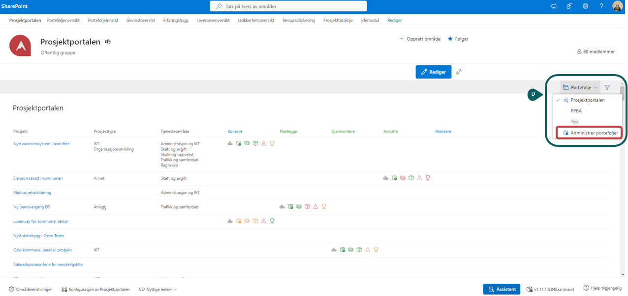 Portfølje meny: Her kan du administrere porteføljer du har tilgang til samt bytte til andre porteføljer. Se bilde og mer info under (D).