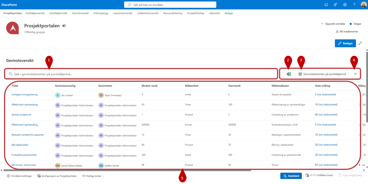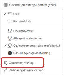 - Knappen benyttes for å eksportere listen til Excel. Hvis du har filtrert listen for å se på spesifikke prosjekter, er det kun de du ser som vil bli eksportert ut. Pass derfor på at eventuell filtrering er i tråd med det du ønsker å eksportere, og tilbakestill filtre om du ønsker å eksportere en oversikt over samtlige prosjekt. 3) Her kan du velge mellom eksisterende visninger, editere visning og Oprette nye visning