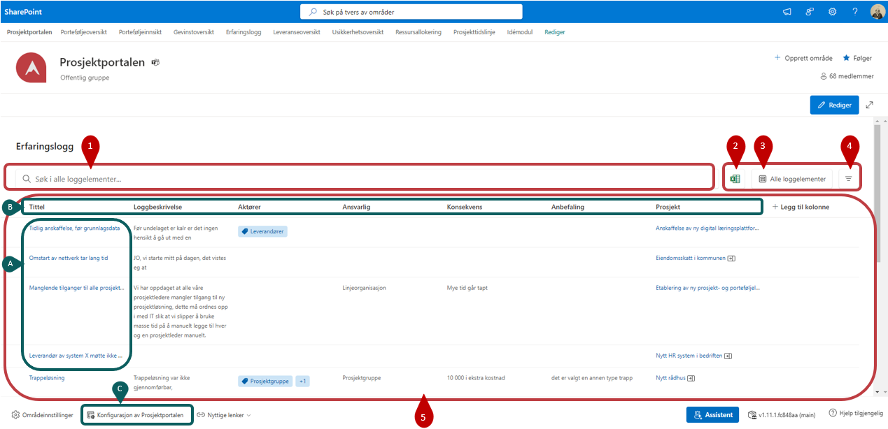 5) I denne delen finner du selve oversikten. Alle erfaringer som er delt med porteføljenivået vil vises i dette feltet. Husk at du ser bare erfaringer fra prosjekter du har tilgang til.