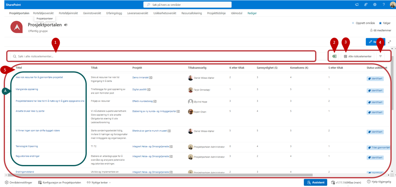 Usikkerhetsoversikten viser usikkerheter (det vil si risikoer og muligheter) som er valgt for visning på porteføljenivå i prosjektene. Du ser bare usikkerheter fra de prosjektene som du har tilgang til.