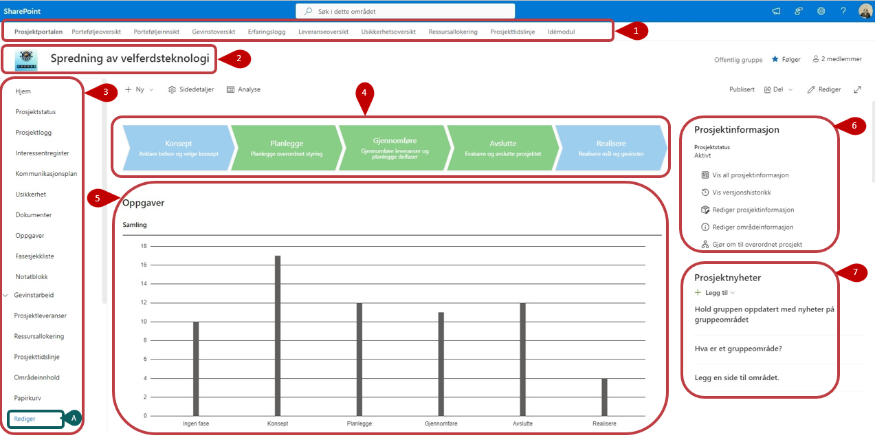 Prosjektnyheter fungerer som prosjektets informasjonskanal. Prosjektnyheter som publiseres i prosjektet blir aggregert opp og vises på porteføljenivå.