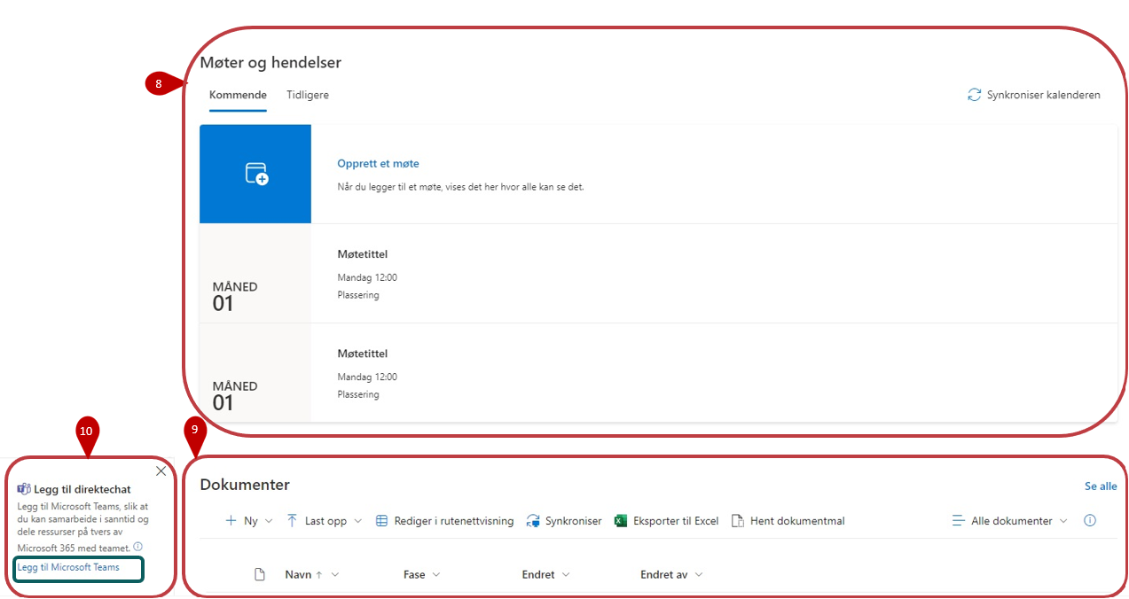 Møter og hendelser vil vise de hendelser som er lagt inn i gruppekalenderen i Outlook.