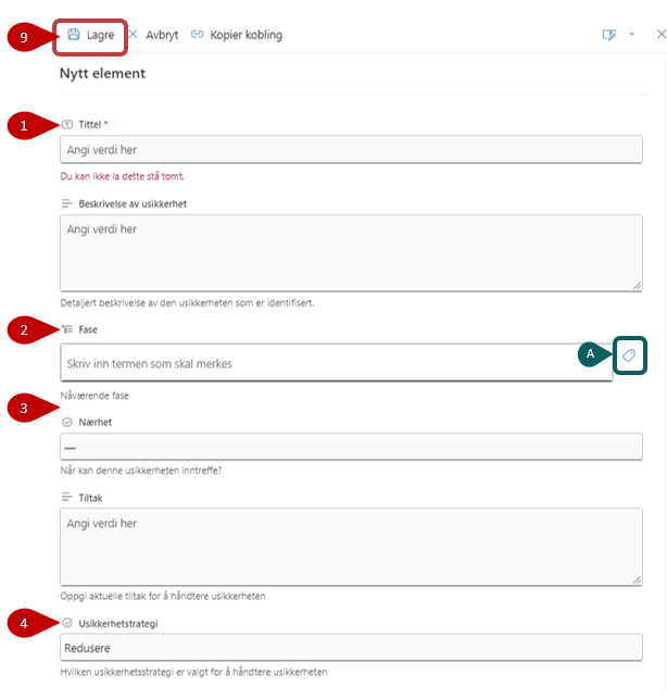- Feltet Tittel er markert med stjerne, disse er obligatoriske å fylle ut, og du får ikke lagret før det er gjort.