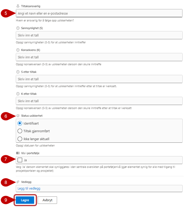 - Tiltaksansvarlig - her skal man legge in den som er ansvarlig for usikkerheten