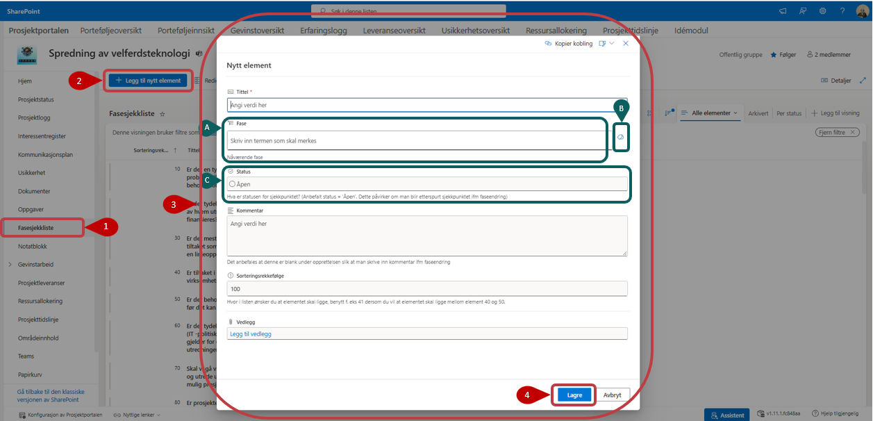 A) Fase - Oppgi fasen som sjekklisten skal tilhøre