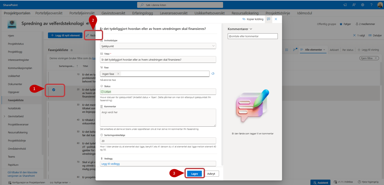 - velg Rediger på toppen av siden over listen. Redigere egenskapene på prosjektet i den nye siden som kommer opp. Husk å la et fasesjekkpunkt stå som Åpen på status dersom det er et punkt som skal bli tatt stilling til på et senere tidspunkt.