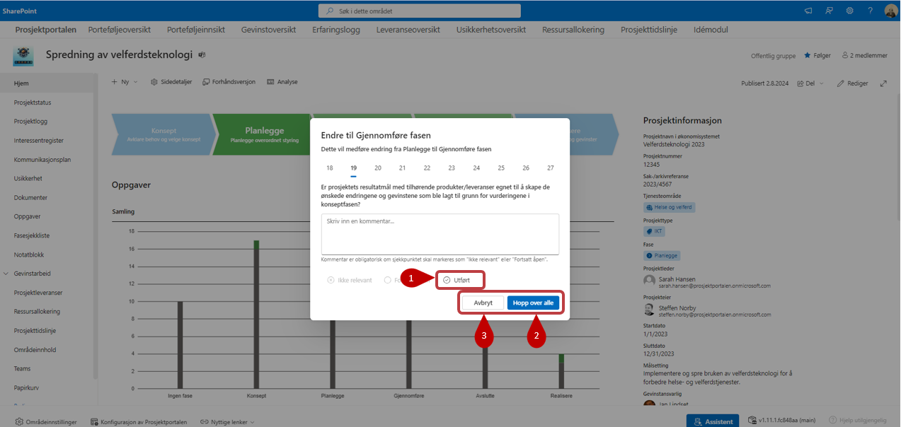 Dersom noen av fasesjekkpunktene ikke er utført, vil en dialogboks åpne seg og du blir bedt om å besvare de gjenstående fasesjekkpunktene og kommentere sjekkpunktene.