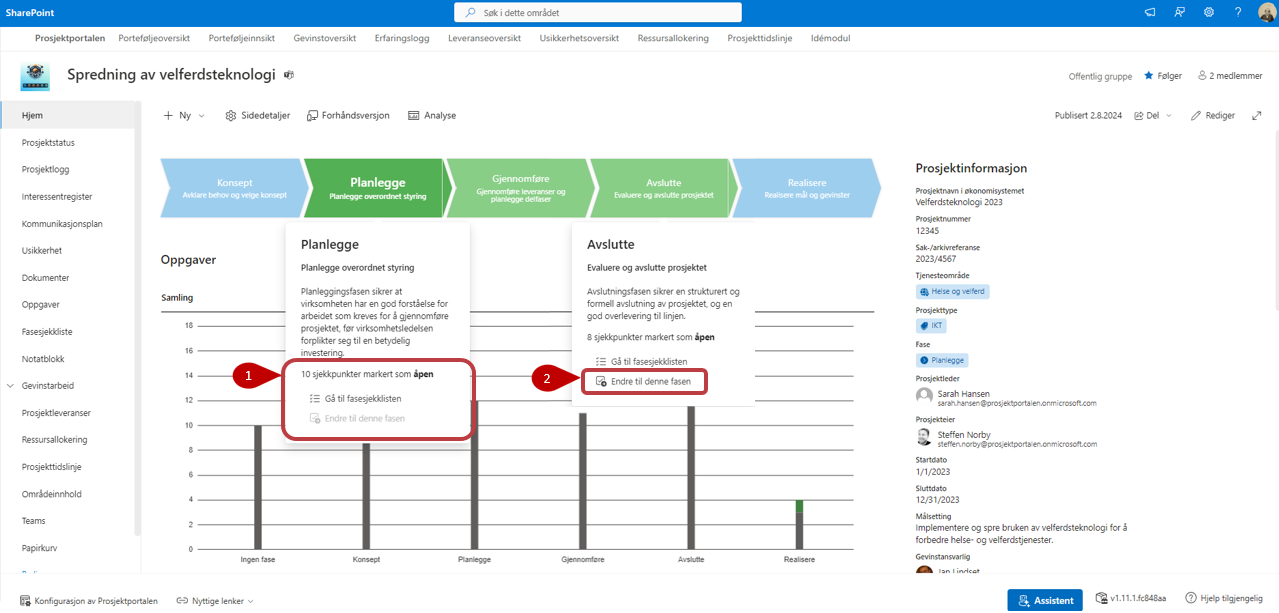 Når du har kommet til faseendring i prosjektet, trykker du på Endre til denne fasen under den nye fasen (i bildet under vil vi endre fra Konsept-fasen til Planlegge-fasen).