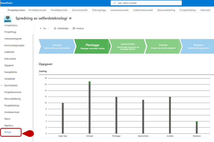 Her finner du alt du har slettet fra prosjektområdet, og kan gjenopprette elementer om du har slettet noe ved uhell. Områdeeier kan se alt som er slettet, og kan gjenopprette uavhengig om det ble slettet av noen andre. Du kan lære mer om papirkurven i Microsoft sine egne supportsider.