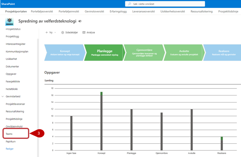 - Etter at teamet er opprettet vil denne koblingen skjules og erstattes med menyvalget Teams, som legger seg inn mellom områdeinnhold og Papirkurv. Med dette menyvalget vil du kunne gå rett over i Microsoft Teams hvor du kan fortsette å arbeide mot prosjektet.